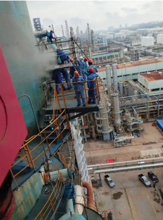 训练有素的静设备专业通过精心组织,将4套焊接设备、预制材料、现场工具、防护装备分区分段运送到高度55m的检修作业面,在方案确定后20分钟动火,经过2.5小时高强度作业后,成功封堵漏点。