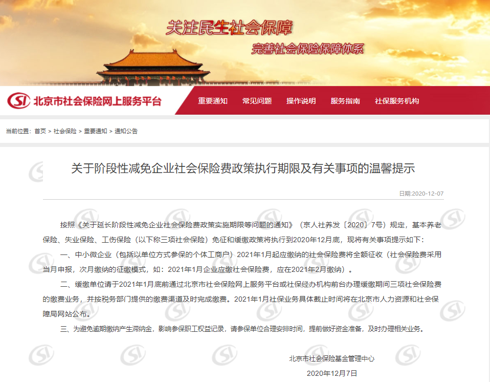 1、中小微企业注意了,社保免征和缓缴政策执行到2020年12月底,2021年1月起应缴纳的社会保险将全额征收!